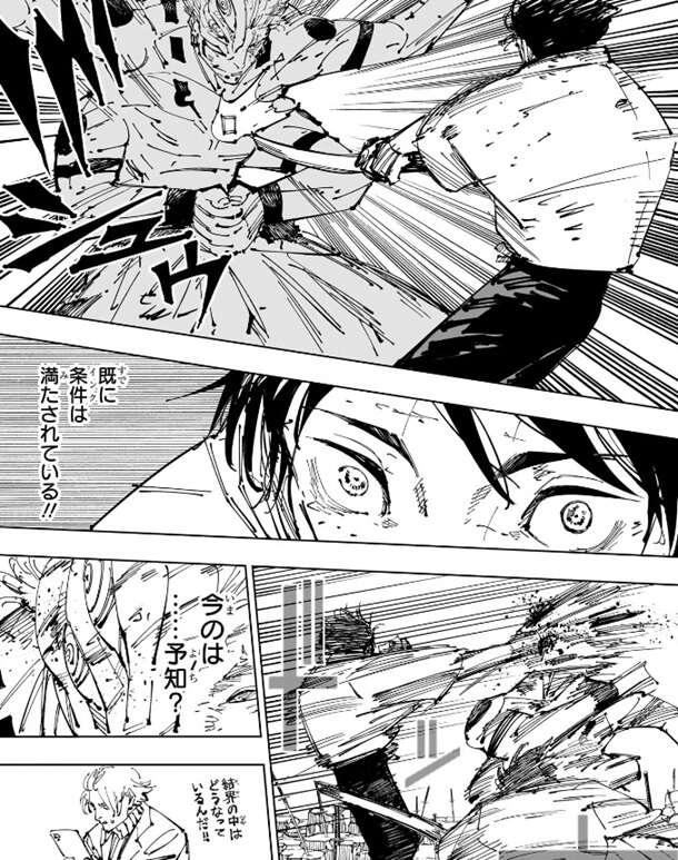 乙骨も虎杖も宿儺が手強いと認めつつ、この領域で決着をつけないと後が怖いと、再び宿儺に挑みます。乙骨はさらに新たな刀を抜き、次はシャルル・ベルナールの術式・「G戦杖」を使います。既に条件(インク)は満たされている!!と、乙骨は心の中でつぶやき、宿儺の動きを予知すると、顔面にパンチをくらわせます。決戦前に乙骨はシャルル・ベルナールと会って術式を模倣(コピー)していたようで、現在シャルル・ベルナールは新宿の決戦を観戦しているようです。
