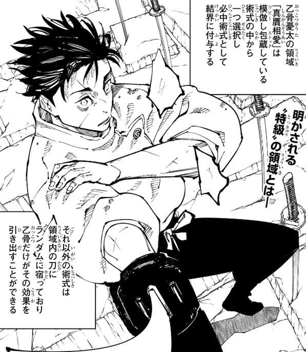 乙骨の領域「真贋相愛」は模倣(コピー)し包蔵(ストック)している術式の中から、一つを選択し必中術式として結界に付与するそうです。今回は天使の術式・邪去侮の梯子が付与されているようです。そして、それ以外の術式は領域内の刀にランダムで宿っており、乙骨だけがその効果を引き出すことが出来るそうです。ただし、どの刀にどの術式が宿っているかは、乙骨も刀を手にするまで分からず、刀は一度術式を解放すると消滅するそうです。本数に制限はないそうで、一度術式を使って消滅しても、もう一度使いたい術式を引き当てることが出来れば何度でも術式を使えそうです。前回、烏鷺亨子の術式・宇守羅彈を使えたのも、直前に抜いた刀に烏鷺亨子の術式が宿っていたから宇守羅彈を使えたようです。