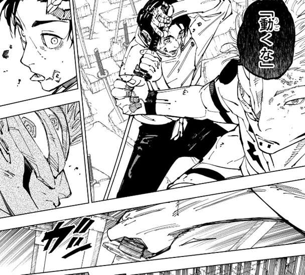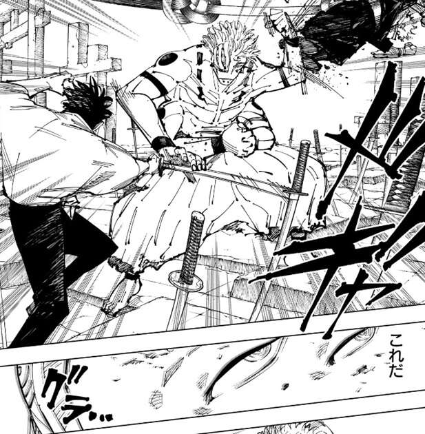 乙骨が呼び出した式神にはドルゥヴ・ラクダワラの術式が使われていたようで、宿儺は式神の軌跡に触れて負傷してしまいます。ドルゥヴ・ラクダワラの術式は、式神の軌道を自らの領域とし不可侵の結界を張る術式で、宿儺は不可侵の結界に触れたため負傷したようです。さらに乙骨は新たな刀を抜いたようで、再び烏鷺亨子の空間を面で操る術式を使い、空間を歪めて宿儺の目を攪乱しようとします。