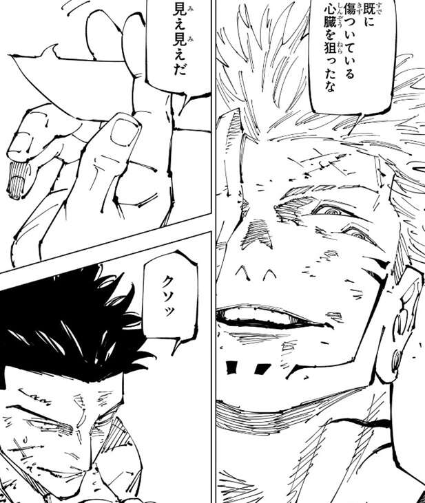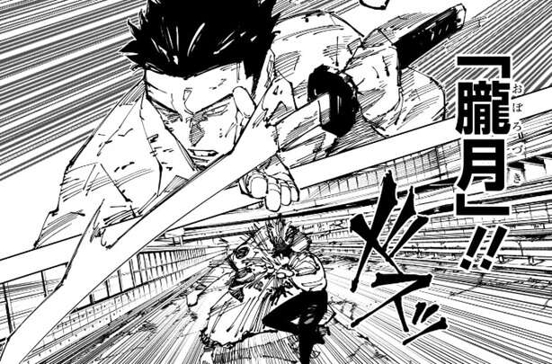 覚悟を決めた日下部はシン・陰流 簡易領域を展開、さらに居合「夕月」で居合の構えをとります。宿儺は、居合?斬撃を飛ばせる俺相手に?と、驚いたようですが、日下部には考えがありました。