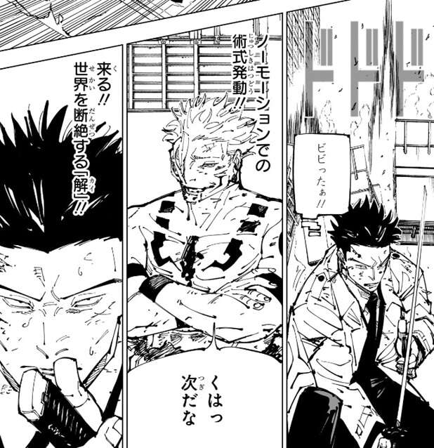 場面は日下部と宿儺の戦いに戻り、日下部は宿儺が世界を断絶する斬撃を使う為にタメが必要と推測しており、実際に宿儺は世界を断絶する斬撃を使うのに掌印を結んだり、呪詞の詠唱を行ったりしています。日下部はそのタメの時間を狙って簡易領域を広げて、宿儺を領域の範囲内に引き込みます。再び回想に入り冥冥は、日下部のシン・陰流の居合は基本的にカウンター狙いで、相手を誘い込むものだが、日下部は後から簡易領域を広げて相手を引き込め、そしてその領域内に侵入したものをフルオートで迎撃するプログラムが組み込まれている、と日下部の強みを説明します。