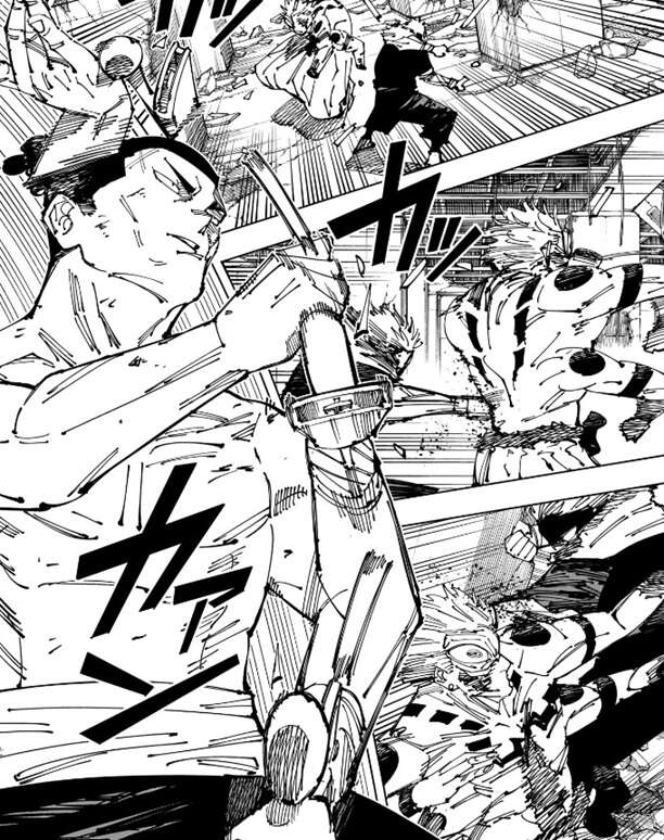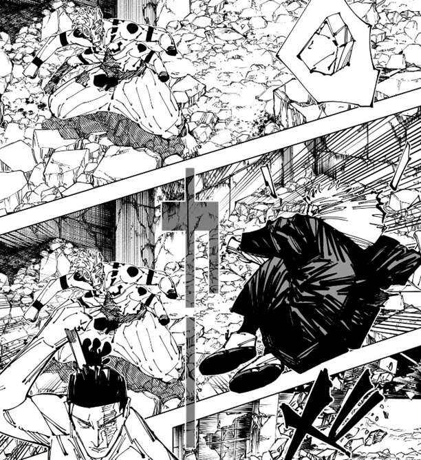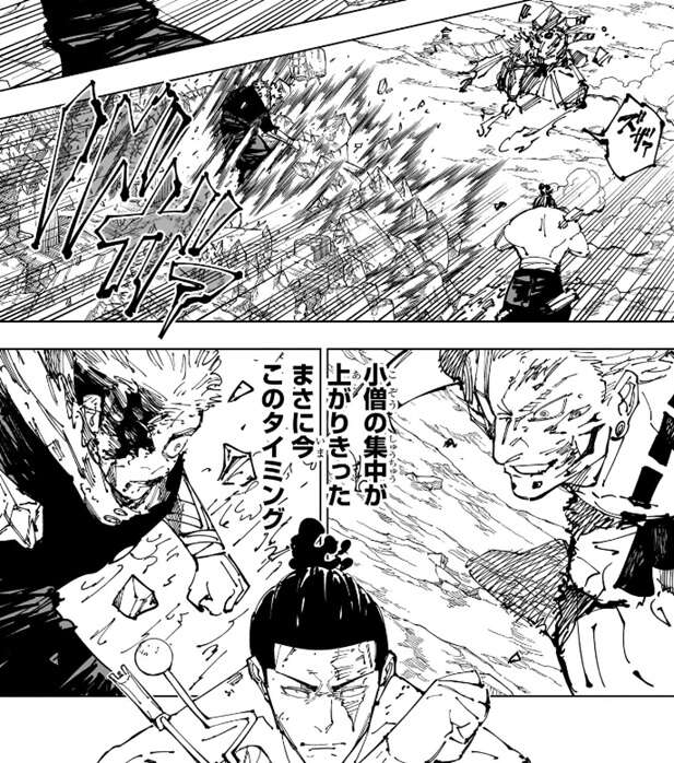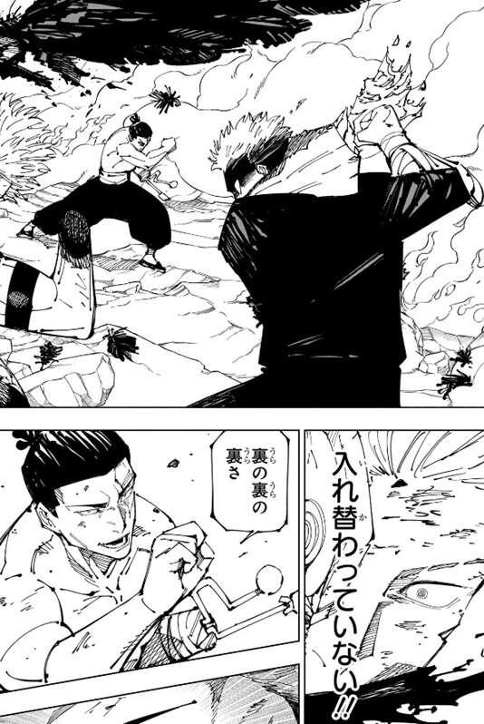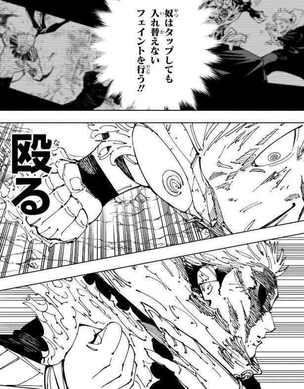 過去に虎杖の中で漏瑚や真人との戦いを見ていた宿儺は、漏瑚や真人との戦いでも東堂が入れ替えないフェイントを行っていて、このタイミングでもそのフェイントを行うと考え、逆にフェイントを利用して虎杖にパンチを入れようとします。一方、虎杖も拳に呪力を込めて宿儺を殴ろうとする姿勢を取ります。