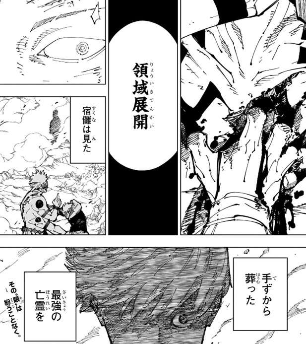 宿儺の出血は激しくなりますが、宿儺は虎杖の攻撃を無視してさらに領域展開「伏魔御廚子」を使用しようとします。呪力効率の高い宿儺ならば乙骨憂太と同程度まで萎んだ呪力でも、焼き切れた術式さえ復活すれば何度でも領域は展開できるようです。この短い時間で宿儺は焼き切れた術式を復活させていたようですが、領域展開を使用しようとした瞬間、宿儺は煙の間に人影を見ます。その人影は宿儺が手ずから葬った最強の亡霊でした。