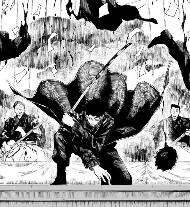 しかし、今チヒロと戦っている3人は昼彦が選定した野良の妖術師で腰の入れ方はわかっている部類のようで、連携もそれなりに出来るようです。一方、チヒロは昼彦の紙の妖術によって視界を的確に邪魔され、さらに味方の妖術師の誘導もしています。今、チヒロと3人の妖術師は劇場の屋根で戦っていますが、昼彦は味方の妖術師を劇場の下に落ちてくるような攻撃をするように紙の妖術で指示します。