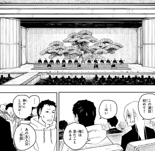 演劇の劇場に入った昼彦は、漆羽は仙沓寺の刺客に任せて楽しもうと考え、隣の客に話しかけます。この演目の主人公“佐助”は、物語の最後に黒鬼を退治し、家族を取り戻し島は平和になる、と勝手に隣の客に物語のあらすじを話し始めます。