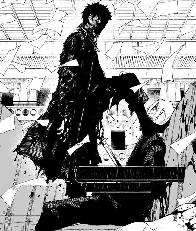昼彦は今し方中断された演劇の中で敵が人質をとるシーンがあり、その時主人公の“佐助”は身動きが取れず敵を一時逃がすことになるが、この身動きが取れなかった“佐助”はクソだと頭の中でつぶやきます。“佐助”は人を斬り殺すクセに肝心な所で人質を気にして英雄を気取る、人間のフリをするな、と昼彦は頭の中でつぶやき、六平千鉱には共感して欲しいと願います。要は誰を犠牲にするかだよ、六平千鉱、と昼彦は言うと、さらに紙を操ってチヒロに観客をぶつけ、チヒロに観客を殺すように仕向けます。