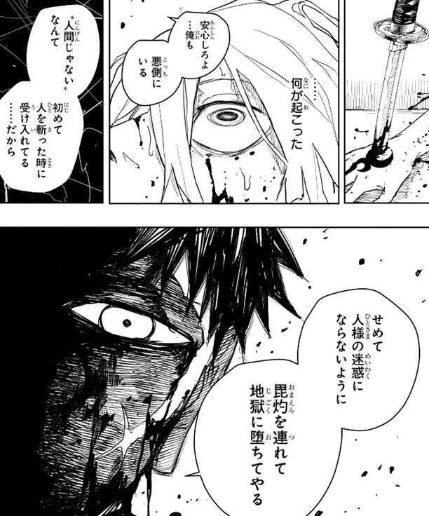 何が起こったか分からず茫然とする昼彦に、安心しろよ、…俺も悪側(こっち)にいる、とチヒロは言います。“人間じゃない”なんて、初めて人を斬った時に受け入れている、……だからせめて人様の迷惑にならないように毘灼(おまえら)を連れて地獄に堕ちてやる、とチヒロは言うと、毘灼の情報を何もかも話すように昼彦に命令します。