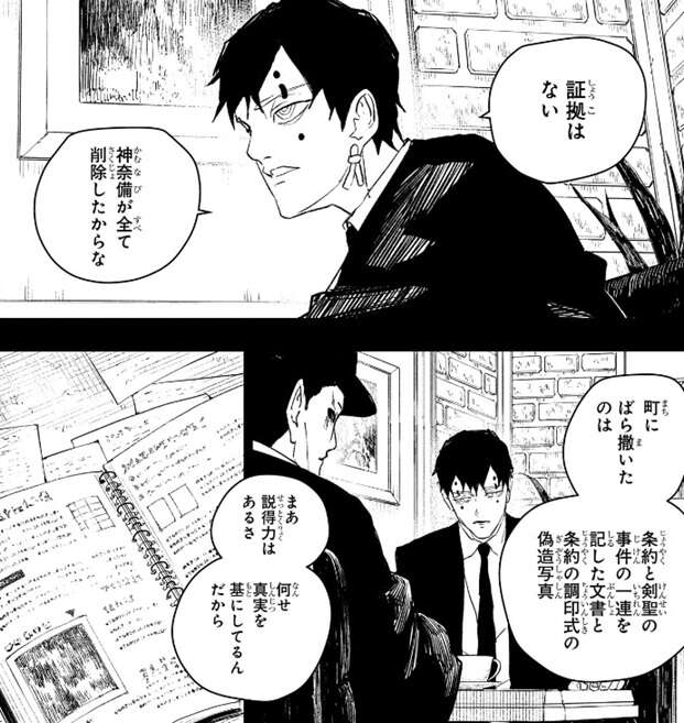 幽は別の黒スーツの男と会話をしていますが、少国民の掃討、剣聖の起こした事件に関して証拠はないと断言します。神奈備が全てを削除していて、さらに町にばら撒いたのは条約と剣聖の事件の一連を記した文書、条約と調印式の偽造書写だったことを黒スーツの男に話します。嘘か本当か怪しいですが、真実に基づいている、説得力はあると幽は言います。ただ、事実に基づいているとはいえ利口な人間は流されないだろうとも幽は言い、そもそも英雄を“人殺し”と中傷する輩はいると言います。ただ、相手は最強の剣豪、どいつも抽象的な中傷は尻込みする、だからじわじわとやると幽は言います。座村はゴミをバラまいていた町の人間の話を聞いて半年前、イヲリが学校に通い出した頃には既に嫌がらせを受けていたのだと気付きます。