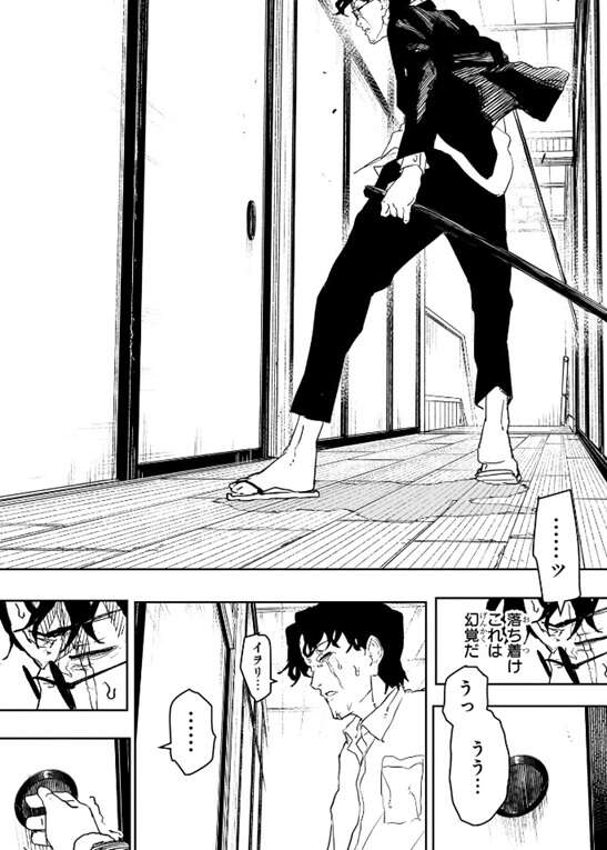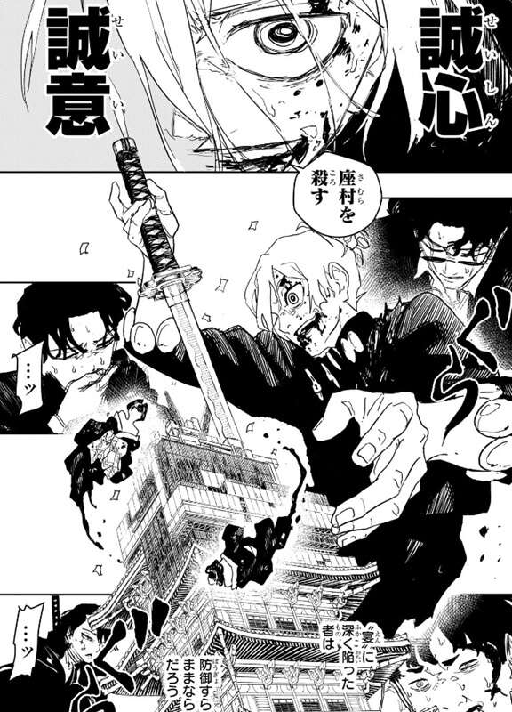 座村はイヲリの存在を忘れ、これまでは“剣聖を殺す”という強烈な使命感だけが彼を動かしていました。しかしイヲリを思い出し、娘を守ると言う具体的な原動力がここへきて補完されますが、イヲリを思い出した事で人一倍繊細な座村は娘が自殺する幻覚を見せられまともに戦えない状態になってしまいます。戦闘力では随一だが、内側はモロい座村と宴の能力は相性抜群だ、と昼彦は言います。