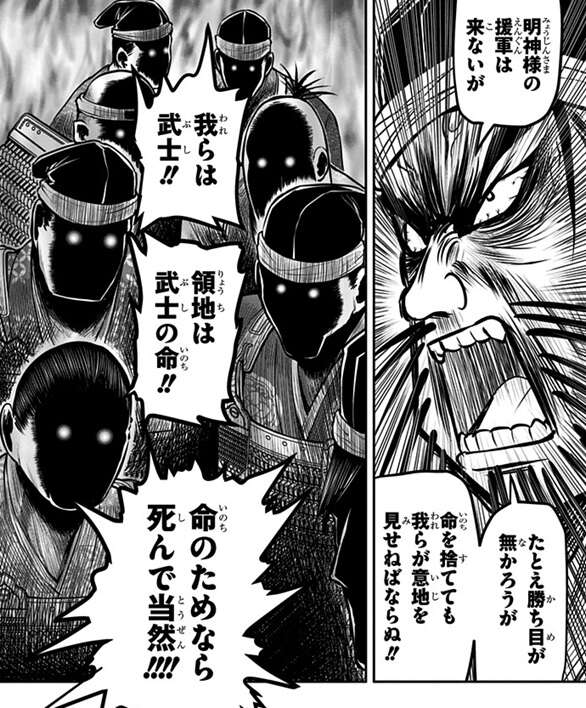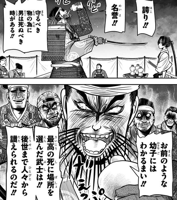 敵の数に圧されて味方がどんどん死んでいく状況でも、保科達は戦う事を止めず喜び勇んで死を選ぼうとします。そんな保科達に時行は、貴方の死に様に何の興味ありません、と静かに怒り忠告します。時行の忠告に怒った保科は、死ぬべき時に死ねないのは生き恥だ、誇りや名誉、守るべき物の為に男は死ぬべき時がある!!と、酒に酔っぱらいながら、時行に語ります。そんな保科に怒りが頂点に達した時行は、酒を保科の顔にぶっかけます。
