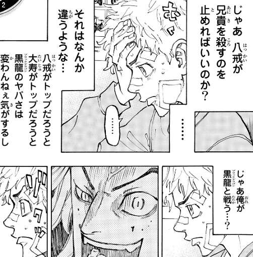 八戒の黒龍入隊と交換に武道は命拾いしますが、武道は八戒が兄の大寿を殺そうとしている事を知ります。八戒が実の兄の大寿を殺して、黒龍を乗っ取り東卍に合流する事であの未来に繋がると考えた武道は、黒龍を何とかしようと悩みますが、いい考えが思い浮かばず一人で抱え込みます。