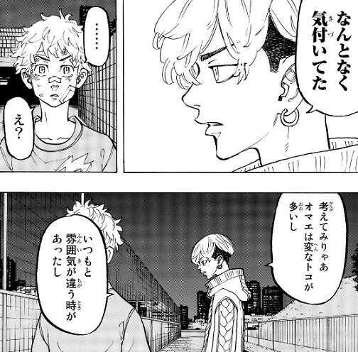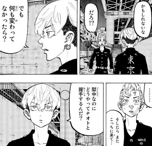 千冬に自分が未来から来たこと、未来で起きる出来事を全て話してしまった武道は、最初はタイムリープの事を他人に話すのはやはりまずいと思い、冗談だと取り繕おうとします。しかし、千冬は武道の話をすべて信じ、これからも最後まで武道を支えると断言します。