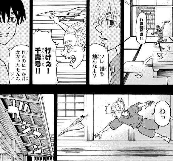 千咒は、自分の兄・三途 春千夜があんなヤパイ奴になったのも、マイキーの“衝動”も全部自分の責任だと言い、小さい頃の話を始めます。千咒は小さい頃、マイキーと場地、春千夜の三人の後ろをいつも追いかけていました。そんなある日、千咒はマイキーが大切にしていたコンコルドのプラモデルを壊してしまいます。さらにマイキーに自分が壊したと千咒は言い出せず、春千夜が壊したと嘘を言ってしまいます。
