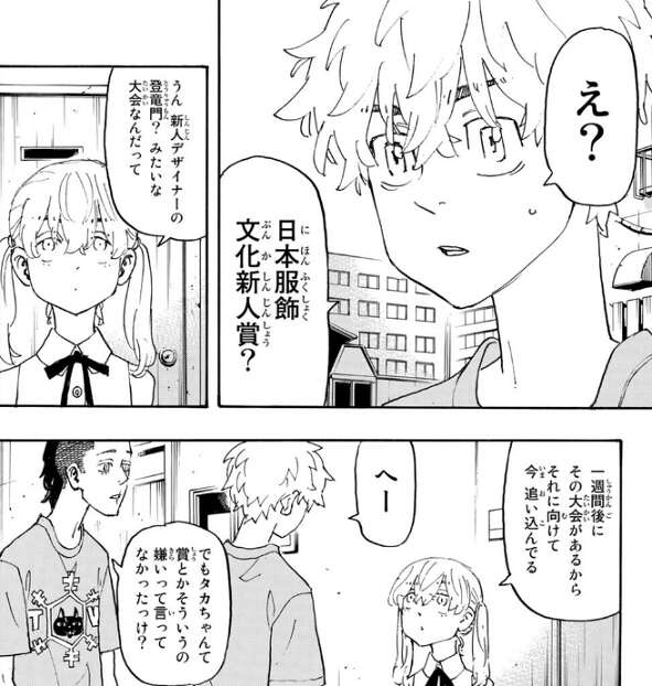 イヌピーも武道のチームに加わり、次は“センス”と“参謀”がチームに足りていないという事で、三ツ谷をチームに加えようと武道は考えます。しかし、三ツ谷は日本服飾文化新人賞の大会に向けて追い込んでいて、武道が作るチームに誘える状況にありませんでした。武道は三ツ谷がデザイナーになろうと頑張っている姿を見て、チームには誘はないと決めます。