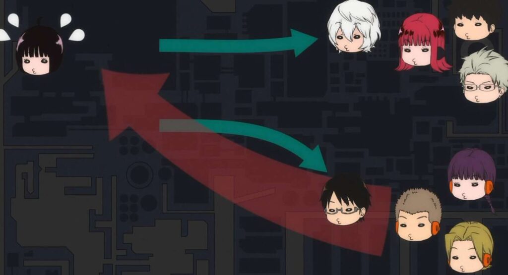 雨取を狙うことで玉狛第2は戦力を柿崎隊か香取隊のどちらかに集中させるか、両方に割くか決断を迫られます。香取隊はバッグワームを起動し、雨取を攻撃しに行きます。それを確認した柿崎隊は一呼吸置いて同じく攻め上がります。