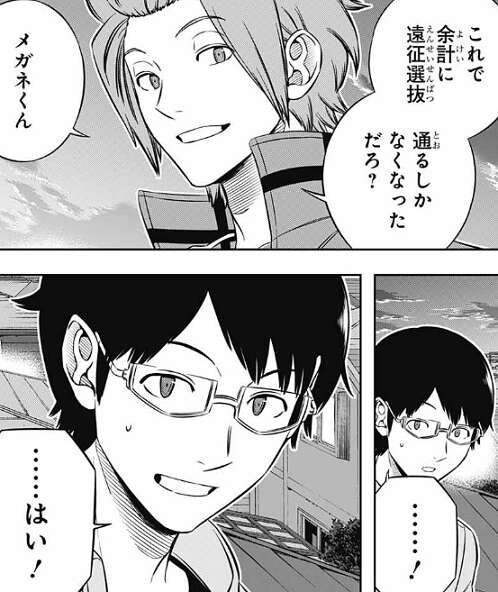 しかし、これで余計に遠征選抜試験、通るしかなくなっただろ?メガネくん、と迅が言うと、……はい!と三雲は力強く迅に答えます。ここで、さっきのガロプラの話で1個だけウソがあったと空閑が言います。一番最初の名前の所で嘘を言っていた、と空閑は言います。