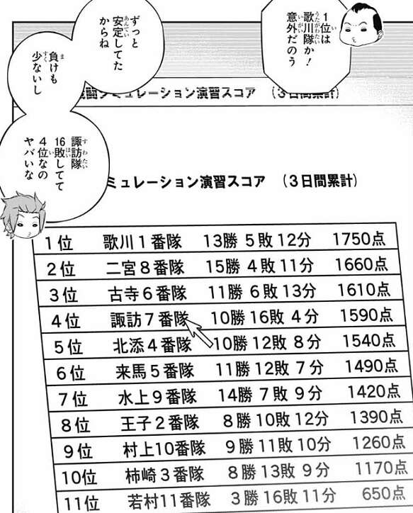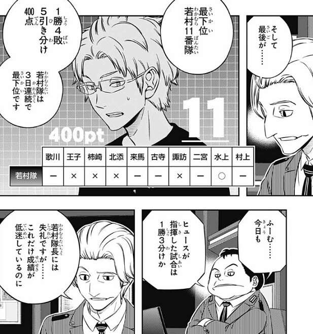 こうして戦闘シミュ前の説明が終わり場面は運営本部デスクへ戻り、水上9番隊の成績は10位で2勝7敗1引き分け、440点でした。水上の予告した通り2勝していますが、真木辺りが、詭弁だね、と言いそうな内容だ、と鬼怒田がつぶやいています。しかし、水上の戦略は上位4チームに絞った対策だけでなく、前の日に下位の何チームかに宛てて上位チームのユニット情報を流していたそうです。隊員に無茶な要求をする一方で、別のルートからも手を打っていた、と城戸は評価しているようです。こういう人材がいると楽なのではないのかね?と、城戸が忍田に質問しますが、時と場合による、渋い顔で答えます。どうやら林藤の事が頭をよぎったようです。