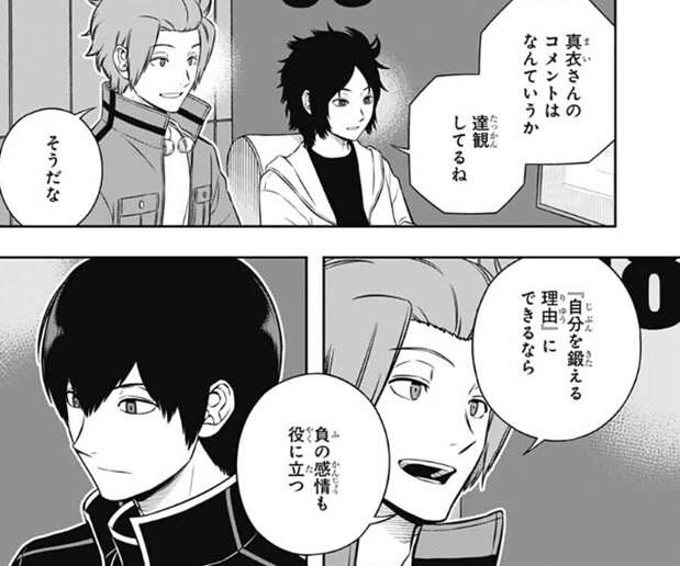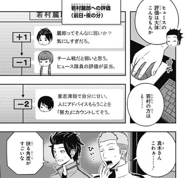 一方、加古隊の真衣は達観したようなコメントをプラス評価で若村に残し、天羽は達観しているねとコメントし、迅は『自分を鍛える理由』にできるなら、負の感情も役に立つ、とコメントします。