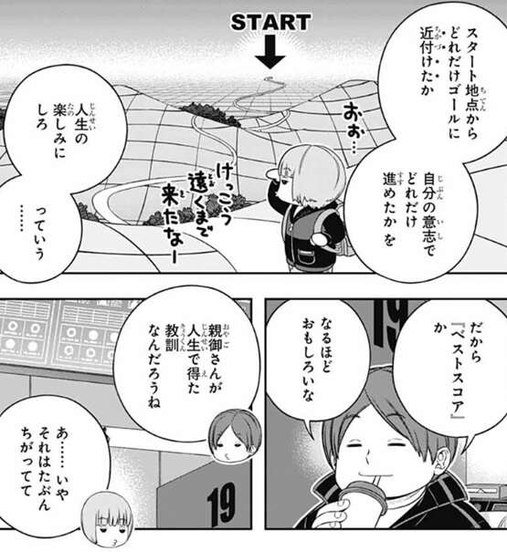 ゴールに拘るのでなく、スタート地点からどれだけゴールに近付けたか、自分の意志でどれだけ進めたか、を人生の楽しみにしろ、と時枝の親は言っていたそうで、寺島はその時枝の親が言っていた事を面白いと言います。しかし、これは時枝の親の人生で得た教訓ではないそうで、時枝は最初のネイバー侵攻のあと、しばらく変に無気力を感じていた時期があったそうです。