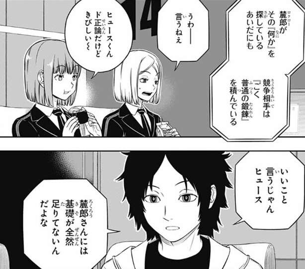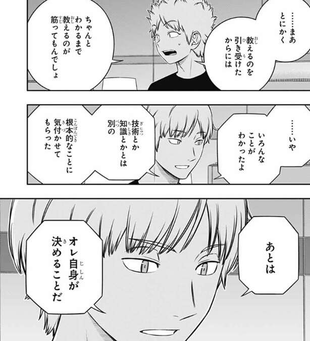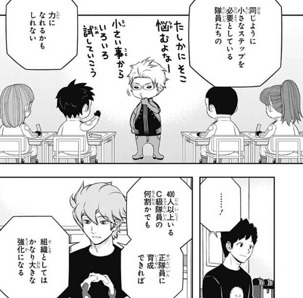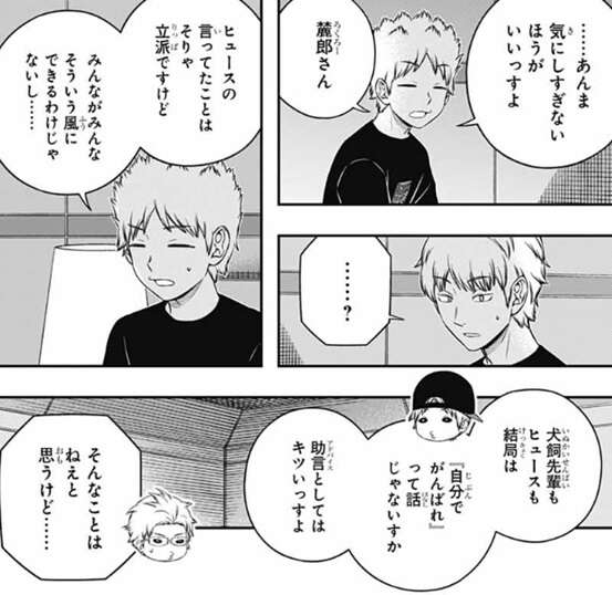 戦力の底上げのための『教官』としては、香取のような直感タイプは難しいとヒュースは言い、三雲も少々特殊過ぎると言います。そして、現時点では若村はおそらく臨時隊長の中では未熟な部類だろうが、この先自分の力で壁を越える経験を積んでいけるとしたら、とヒュースは仮定の話をします。