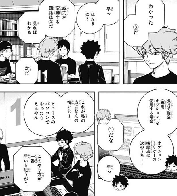 しかし、木虎は問題なのはこのトリックを解いたチームが今日、諏訪7番隊と同じような事が出来るということです、と言います。射程攻撃全般に対策は必須だと小寺は言い、弾対策専門のユニットを追加する感じか?と、奥寺が答えます。その場合、そのユニットは誰が操作するかという会話を奥寺と三浦がしていると、小寺は一昨日の諏訪隊との戦闘シミュを思い出し何かに気付きます。