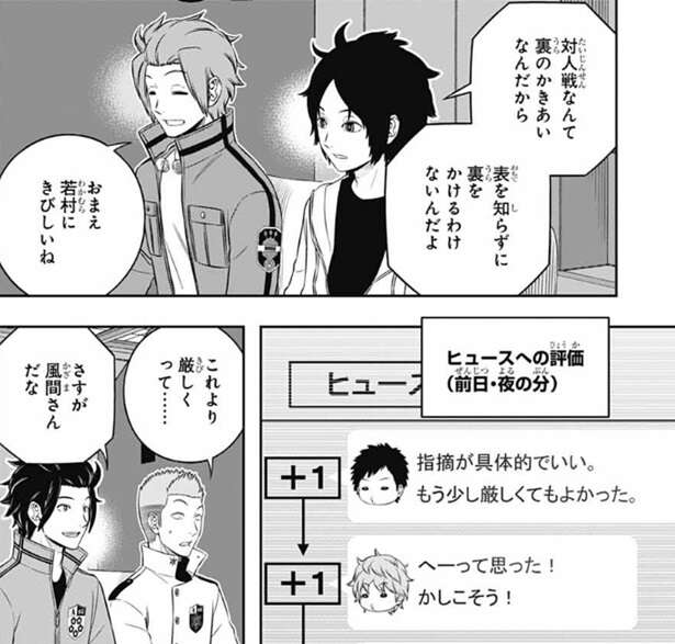 天羽は、対人戦なんて裏のかきあいなんだから、表を知らずに裏をかけるわけないんだよ、と厳しい意見を言い、おまえ若村にきびしいね、と迅に言われます。他にもヒュースへの評価のコメントを見ると賛否両論と言った感じですが、プラス評価が多いようです。加古、冬島、草壁隊の佐伯竜司がマイナス評価を付けています。