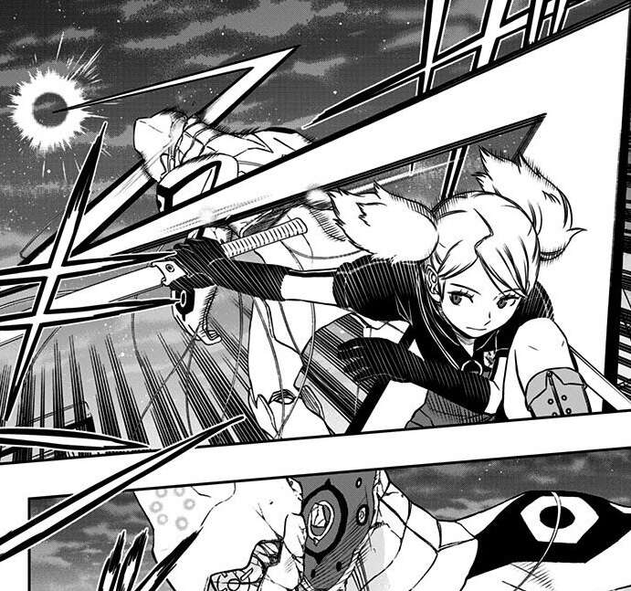 本部基地の外の戦いは、ボーダー側の連携も功をそうして有利に戦況をすすめられています。そこにトリオン兵の中に複数体動きの良いトリオン兵が現れ、ボーダーの連携が取りづらくなります。笹森、辻、木虎、黒江が動きの良いトリオン兵の対処に向かい、黒江の「韋駄天」と木虎の連携であっさりと倒します。が、トリオン兵はガロプラのヨミが操作していて、別のトリオン兵を操作する事で黒江の動きに対応してきます。
