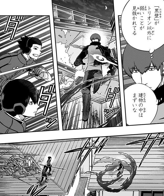 本部基地の外、三輪隊の三輪と米屋はガロプラのコスケロと戦闘状態ですが、コスケロのトリガー「黒壁(ニコキラ)」の液状のトリガー、纏わりつき取れなくなることで使用できなくする効果の前に、なかなか直接攻撃できません。しかし、「黒壁(ニコキラ)」がトリオン以外に弱いと見抜くと、トリオン以外で攻撃し建物の上に追いやります。