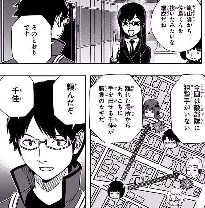 香取隊は得点のほとんどをエースの香取が獲っています。柿崎隊は全員の集中攻撃で点を獲るスタイルで全員が接近戦用と射撃用の武器を持っています。今回はどちらの敵部隊にも狙撃手がいないので、三雲は千佳が勝負のカギになると読み期待します。