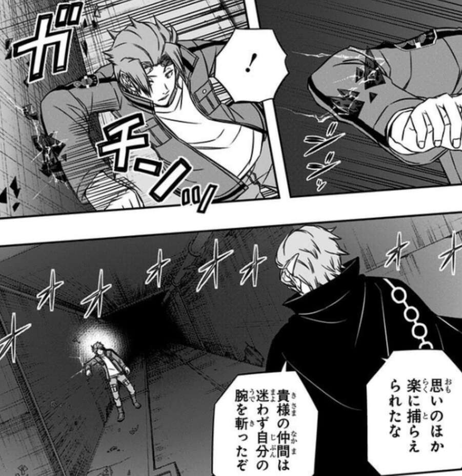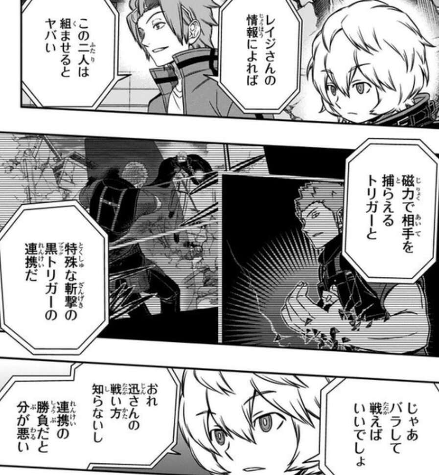 雨取達はヴィザ、ヒュースに追いつかれますが、そこに迅と空閑が加勢に来ます。空閑はヴィザを、迅はヒュースをそれぞれ食い止めて、雨取達C級隊員を基地までに逃がします。レイジの情報からヴィザ、ヒュースを連携させるのはヤバいと判断し、迅と空閑は二人を分断します。